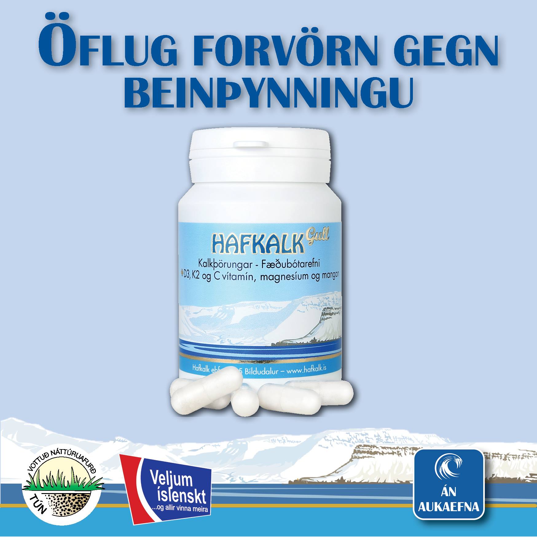 Hafkalk Gull sameinar kalkþörunga úr Arnarfirði með D3, K2, C-vítamíni, magnesíum og mangan til að styðja við sterkara stoðkerfi, betri upptöku kalks og vernd gegn beinþynningu. Þetta er náttúruleg blanda sem vinnur saman til að styrkja bein, brjósk og liði á heilbrigðan hátt.